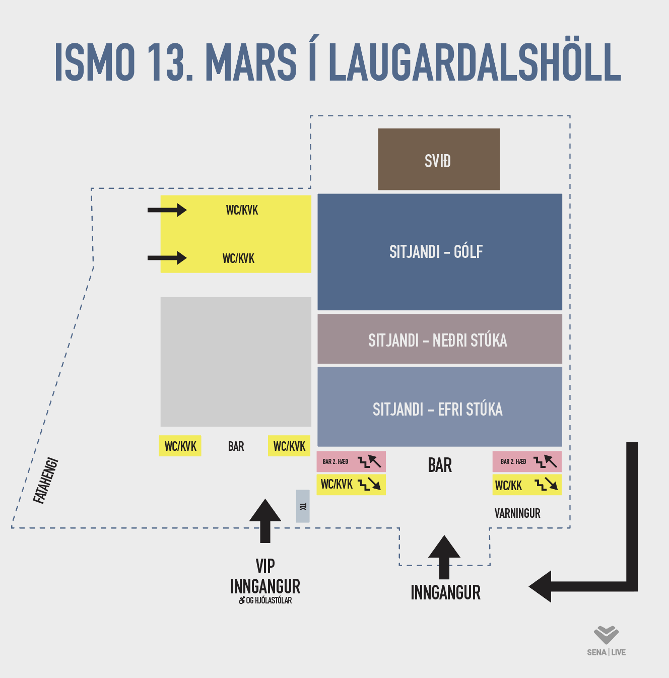 Vertu með miðana þína tilbúna til innskönnunar. Fylgdu svo merkingunum til að finna þitt svæði. Vertu búin að losa þig við alla hluti sem geta valdið skaða eða tjóni. Við getum ekki geymt neitt fyrir þig.